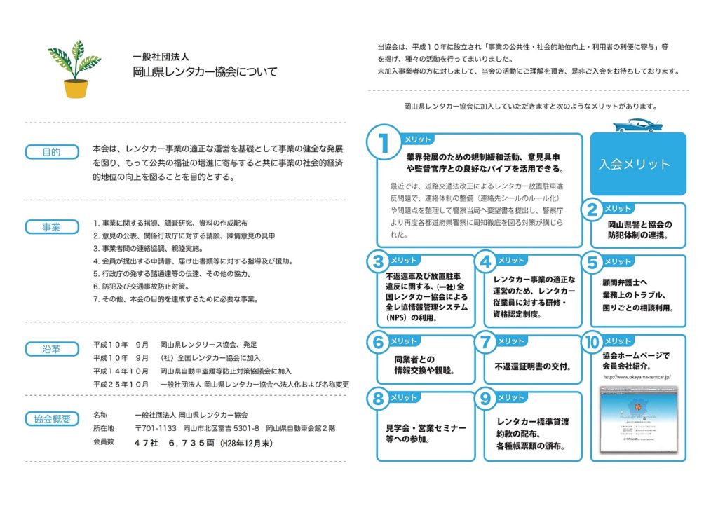 - レンタカー事業に関する知識の普及、広報および宣伝